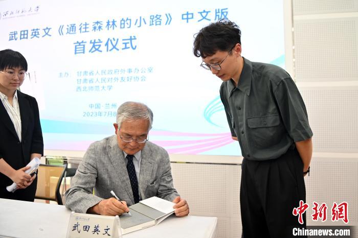 2023年7月8日,武田英文著作《通往森林的小路》中文版首發儀式在蘭州舉行。圖為武田英文給現場嘉賓簽名。 中新社記者 九美旦增 攝