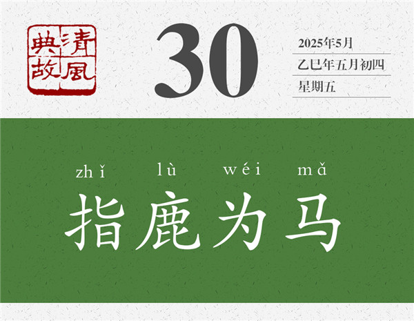 秦始皇死后,大奸臣趙高通過陰謀手段扶胡亥上位,即秦二世,并殺了李斯,自己做了丞相。秦二世昏庸無能,趙高野心勃勃。《史記•秦始皇本紀》:“趙高欲為亂,恐群臣不聽,乃先設驗,持鹿獻于二世,曰:‘馬也。’二世笑曰:‘丞相誤邪?謂鹿為馬。’問左右,左右或默,或言馬以阿順趙高。或言鹿,高因陰中諸言鹿者以法。后群臣皆畏高。”趙高想篡位當皇帝,但又擔心文武百官不服,于是先做了一次試驗,牽來一只鹿獻給秦二世,說:“這是一匹馬。”秦二世笑著說:“丞相你弄錯了吧?怎么說鹿是馬呢。”趙高又問左右大臣,大臣們有的不敢回答,有的說是馬以討好順從趙高。有的大臣說是鹿,趙高就在暗中將那些說是鹿的大臣羅織罪名加以迫害。從此以后,文武百官都畏懼趙高。