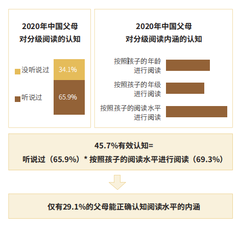 雖然分級閱讀已經成為國際公認的閱讀趨勢,可是,從當當聯合艾瑞發布的《2020年中國K12階段學生“分級閱讀”白皮書》(以下簡稱《白皮書》)中,我們發現中國大部分父母對于分級閱讀尚缺乏認識,更談不上有足夠的重視。《白皮書》指出,有65.9%的父母聽說過“分級閱讀”,而其中真正了解“分級閱讀”的父母只占45.7%。