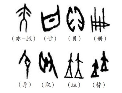 “象形者,畫成其物,隨體詰詘”(《說文·敘》),是根據客觀物象的形態輪廓來構成文字符號的方法。象形字又稱作“文”,“文者,物象之本”。如“貝”就是一個海貝的象形,也指貨幣;“冊”,就是由竹簡編起來的簡冊的象形;“身”為妊娠的形象,突出腹部。