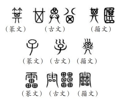 (五)所謂“9353”,指的是《說文》所收全部正篆,即《說文》分析解釋的全部字?!墩f文》收字以篆文為“正”,作為標準字體,這就是許慎所說的“今敘篆文,合以古籀”的收字原則。“今敘篆文”,就是以篆文(小篆)作為標準正字,同時也會根據需要收列部分古文和籀文?!墩f文》所謂“古文”主要是孔子壁中書和民間所獻古文經所用的文字,“籀文”即傳為西周晚期太史籀所編字書《史籀篇》上的文字。從《說文》來看,收入的古文、籀文,主要是與篆文有明顯差異的字形。如篆文“箕”“子”“雷”下所收列的古文、籀文: