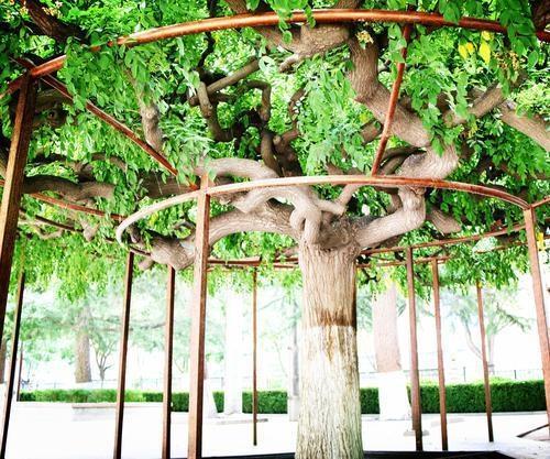 博物館里的這兩棵龍爪槐分別種植在展覽大樓前的東西兩角,是博物館的老專家郭維屏先生所種植。1959年秋冬,甘肅省博物館從通渭路舊館搬遷到七里河的新館,新館內一片荒涼,亟待綠化。而就在此時,郭維屏老先生調入博物館工作,參與到館內的綠植規(guī)劃建設,也正好發(fā)揮自己的藝術特長。這兩棵龍爪槐的幼株是郭老先生從五泉山苗圃選購的,栽種到展覽大樓前院的東西兩角,槐樹的周圍還設計了幾個形狀不一的花壇,花壇內種植了各色各樣的樹木,一眼望去郁郁蔥蔥,生機盎然,頗有些韻味。這兩棵龍爪槐剛栽種時體型嬌小,看起來很不起眼。經過郭老先生和博物館幾代人的悉心栽培,如今已是樹冠優(yōu)美,花香四溢。每到槐花盛開的時候,滿庭飄香,沁人心扉,成了博物館里一道靚麗的景色,引得路人駐足欣賞。東角的龍爪槐高約2米,樹干粗達2尺多,樹冠如傘,頂端長出八、九個主枝向四面伸展,屈曲盤繞,而后又分為數(shù)十個中枝和數(shù)百個小枝,互相攀援,屈折如爪,一枝獨秀。而西角的龍爪槐因基建的原因長勢受到一定影響。