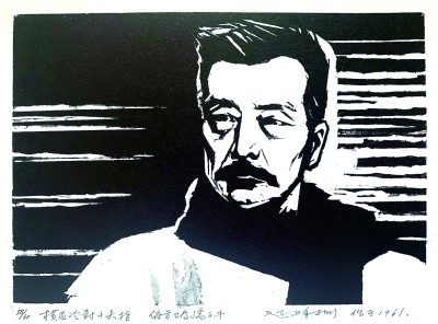 1935年5月28日,魯迅收到賴少其所作木刻《魯迅先生》,為了便于發(fā)表,將其改名后主動推薦到《文學》,并于6月29日回信:“巨大的建筑,總是一木一石疊起來的,我們何妨做做這一木一石呢?我時常做些零碎事,就是為此。”畫中一支明燭在沉沉的墨色中劃出一片的光明,只見一本翻開的厚書上,左頁印著一幅寫有“阿Q”字樣的木刻畫,右頁的祥云之上是搖旗吶喊狀的人群,下方靜靜地躺著一支鵝毛筆。與燈臺相映成趣的是處于中間位置的一罐墨汁,瓶身上刻著一個魯迅頭像,頭像雖然很小,但魯迅濃黑的胡須、清瘦的面容清晰可見,仿佛透出幾分懾人的冷峻。
